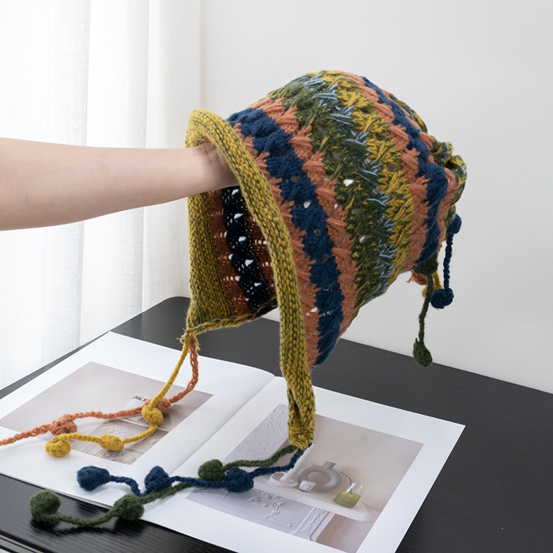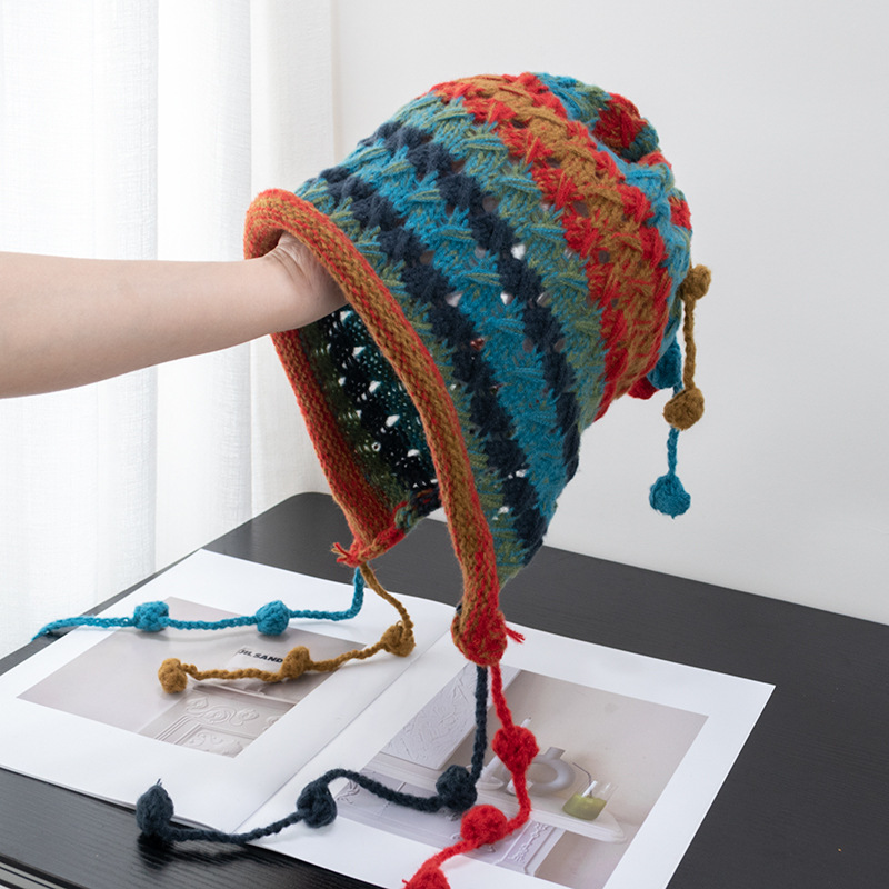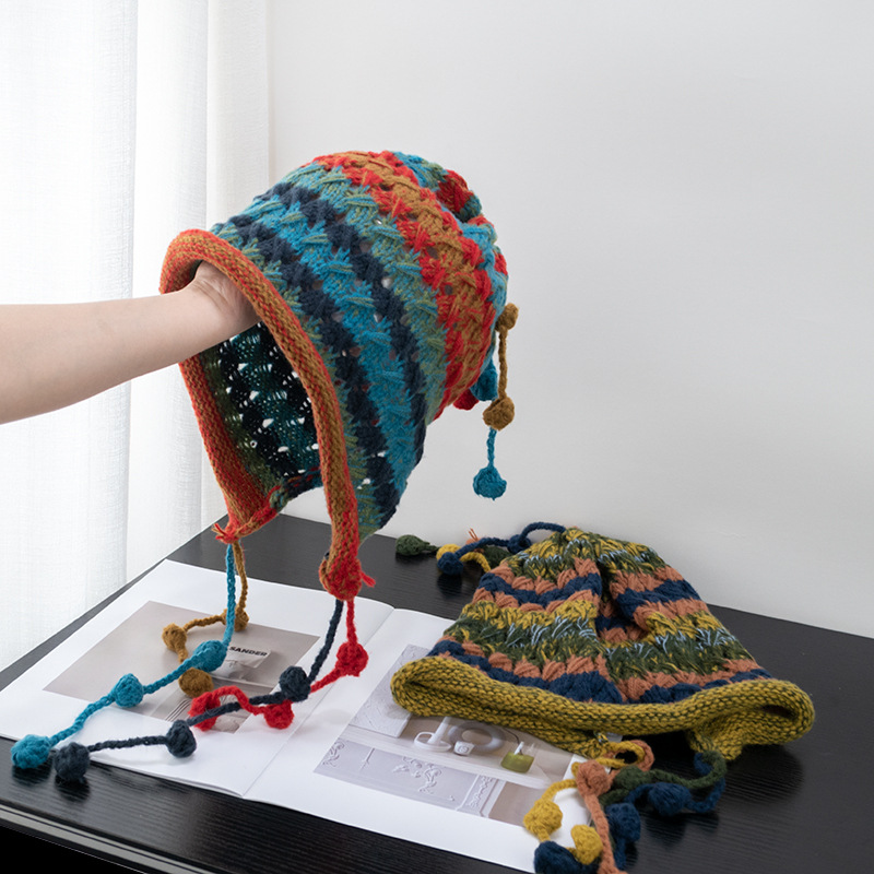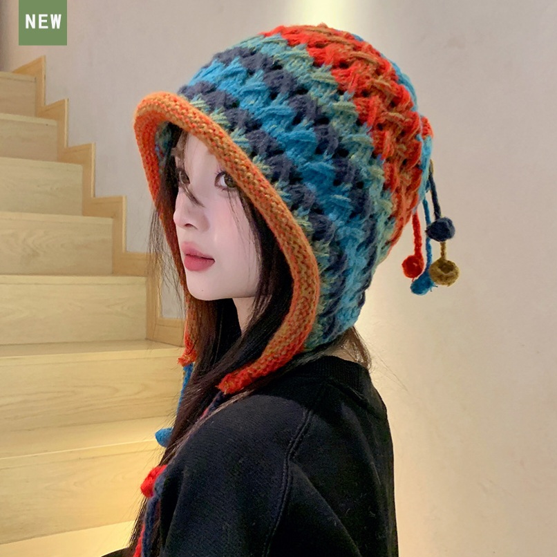 Mũ len trùm đầu tua rua Japan xu hướng thời trang mũ mới nhất năm, phối màu đa sắc, bắt mắt